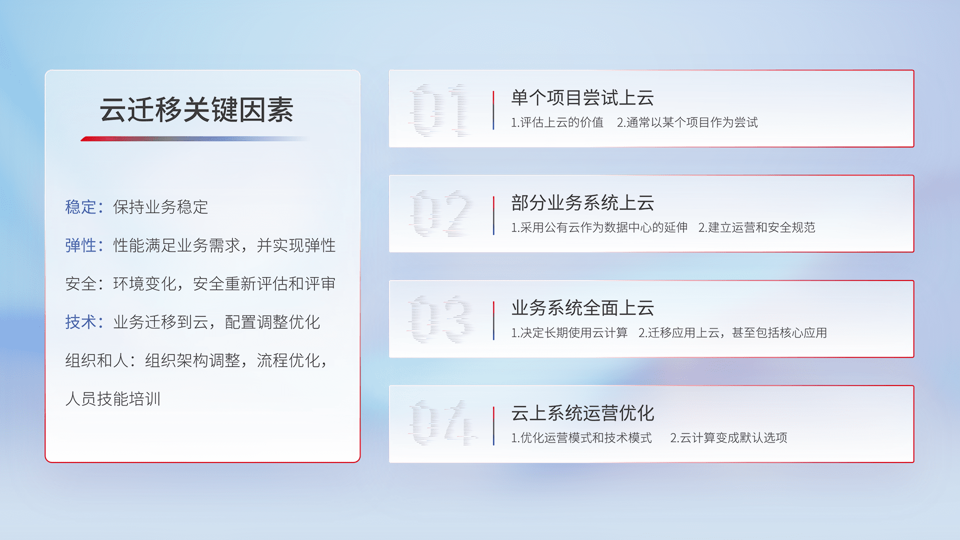 结合实际业务,,,从规划设计、、云平台选型、、、云原生改造、、数据迁移、、、集成交付,,迁移全过程为客户识别最佳上云路径,,做好风险识别管理,,设计网络架构、、、身份权限、、、安全审计合规、、、、操作审计、、、日志审计、、监控告警策略、、、多站点容灾设计等,,,,对云上基础设施进行整体规划,,提升IT治理水平,,,以满足弹性、、、高可用、、、高性能的需求。。。