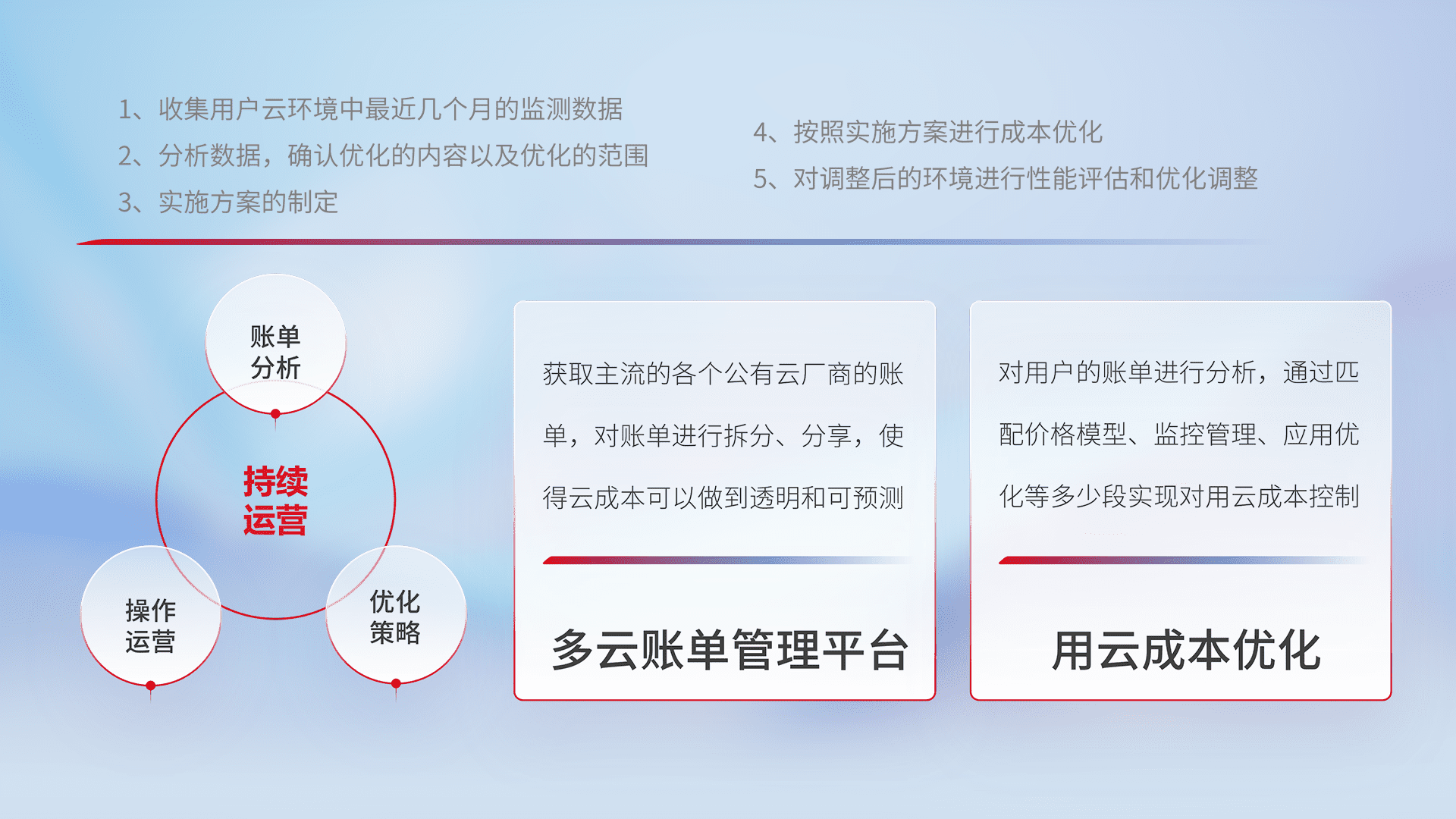 通过多云纳管,,,,以统一的资源数据模型把客户的云资源进行抽象和封装,,,,进而实现对多云资源的统一操作,,,保障云资源管理的可靠性、、、稳定性与可用性。。。。量身定制化运维内容,,配置、、、、开发运维、、、补丁管理、、备份、、、、监控、、、认证和访问管理、、审计和日常巡检等,,,保障在用云过程中的可靠度,,,,稳定度以及高可用率。。。